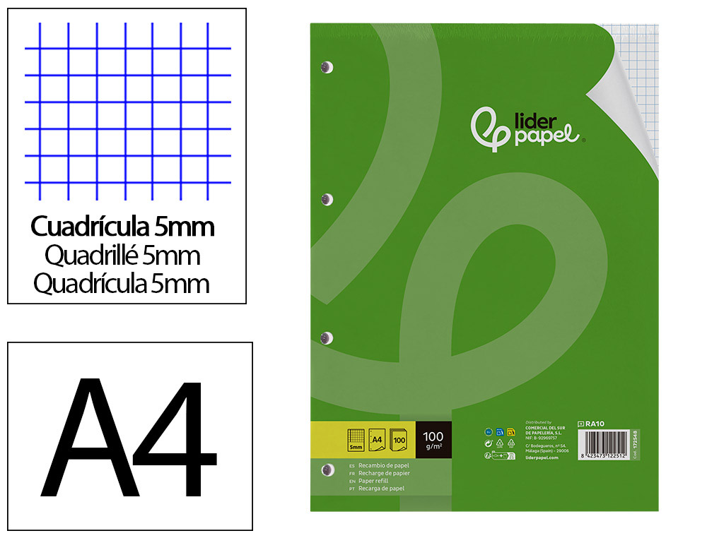 Este recambio de papel A4 cuenta con 100 hojas de alta resistencia gracias a su gramaje de 100 g/m², lo que garantiza durabilidad y evita el traspaso de tinta. Presenta un cuadriculado de 5 mm que facilita la organización precisa de textos, gráficos o cálculos, y está perforado con 4 taladros para una fácil integración en carpetas o archivadores de anillas. Además, incluye bandas en 5 colores diferentes que ayudan a clasificar y diferenciar secciones de forma visual.
